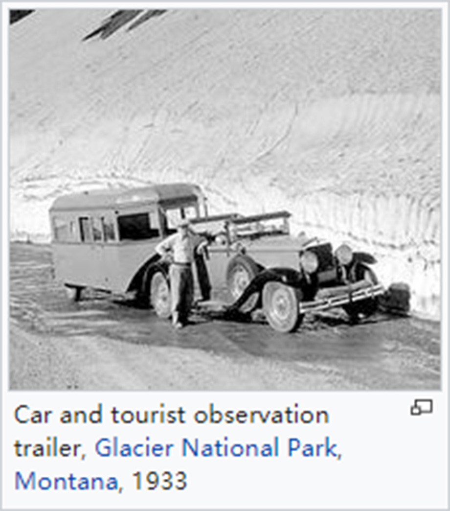 汽车和游客观光拖车,美国蒙大拿州,冰川国家公园,1933年
