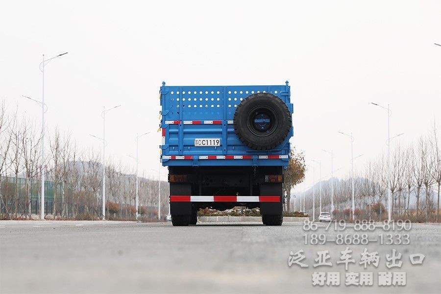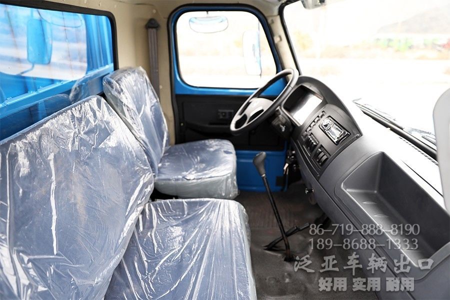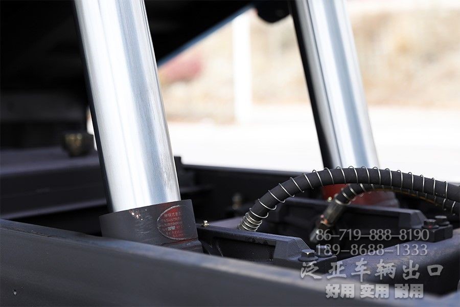 自卸车的车厢分后向倾翻和侧向倾翻两种,通过操纵系统控制活塞杆运动,后向倾翻较普遍,推动活塞杆使车厢倾翻,少数双向倾翻。