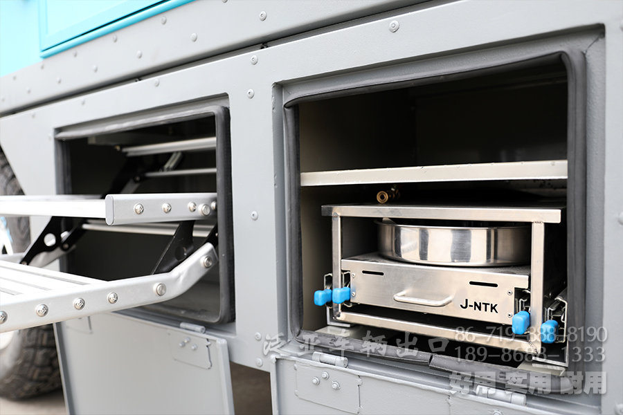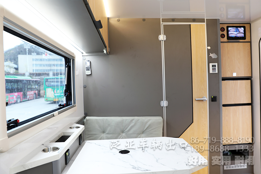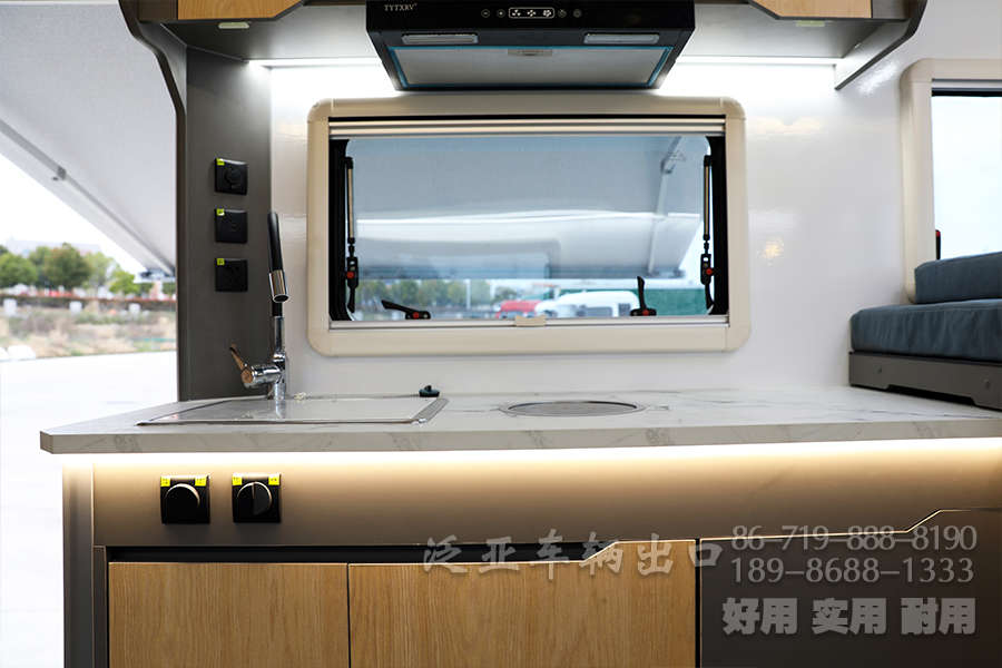房车厢体外有多个储物舱,并配备了照明灯、抽拉灶台、手动遮阳棚、隐藏上车扶手、折叠踏步,车窗采用双层亚克力真空结构(含纱窗、遮阳功能),双层车门。