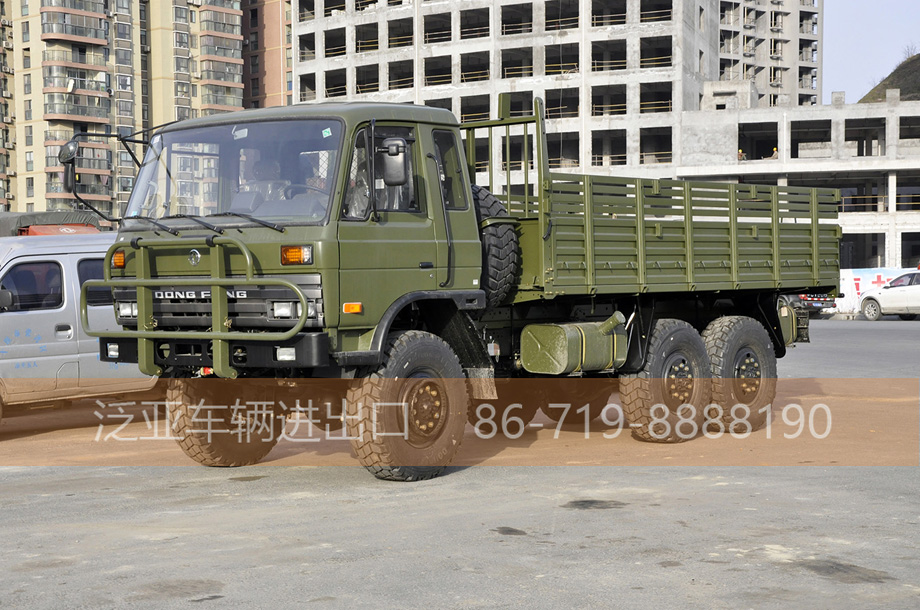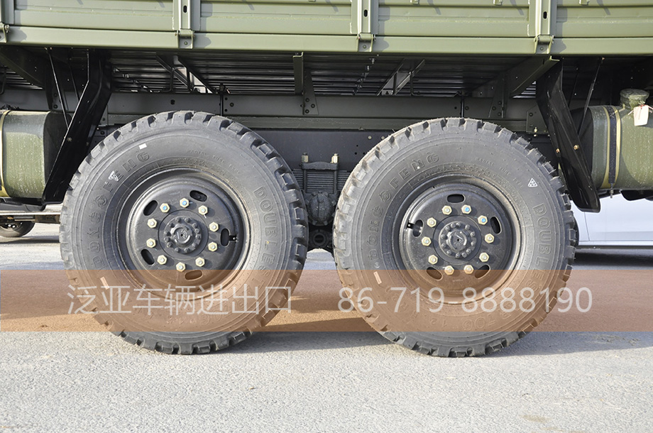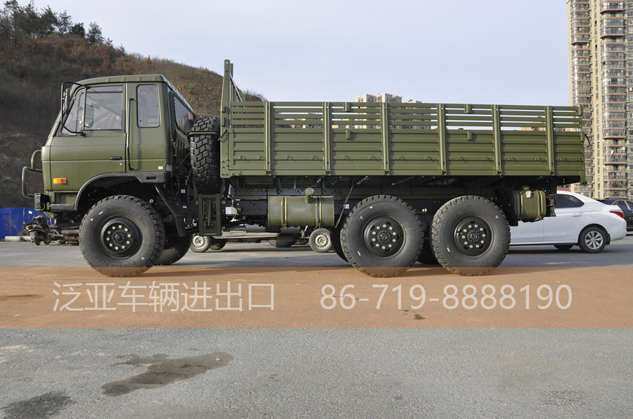 平头排半6×6越野汽车,康明斯170马力增压中冷柴油发动机,12.5R20加宽越野轮胎,6档机械式变速箱,前后桥驱动,防空灯,副油箱,机油桶、水桶,工具箱等军用附加设施,并带棚杆和蓬布,(可选装绞盘)