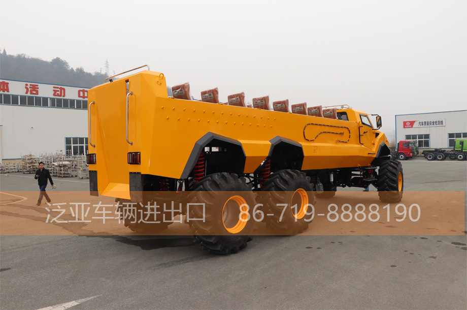 专用配置 | 1、前中后悬架全新开发,自主专利设计(外观设计专利证书ZL 2018 3 0507510.7),弹簧行程大,舒适性和稳定性高; 2、6×6全轮驱动,专利设计(实用新型专利证书ZL2018 2 1593556.6),适应沙漠地区; 3、全新研发的前脸,专业大脚怪式沙漠旅游车; 4、自动开启的尾部仓门,方便乘客上下车; |